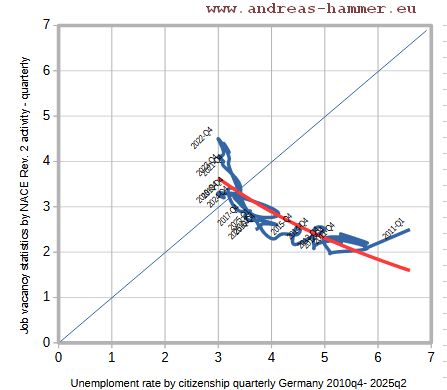 Seit 2023-Q1 geht die Kurve wieder nach rechts unten, vor allem geht die Stellenangebotsquote zurück. Hier zeigt sich am Arbeitsmarkt das niedrigere Wirtschaftswachstum.